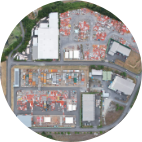 タワークレーンでは対応できない場所をカバーするように7基の橋形クレーンを配置。整備棟や製缶棟への大型機器の移動を行います。